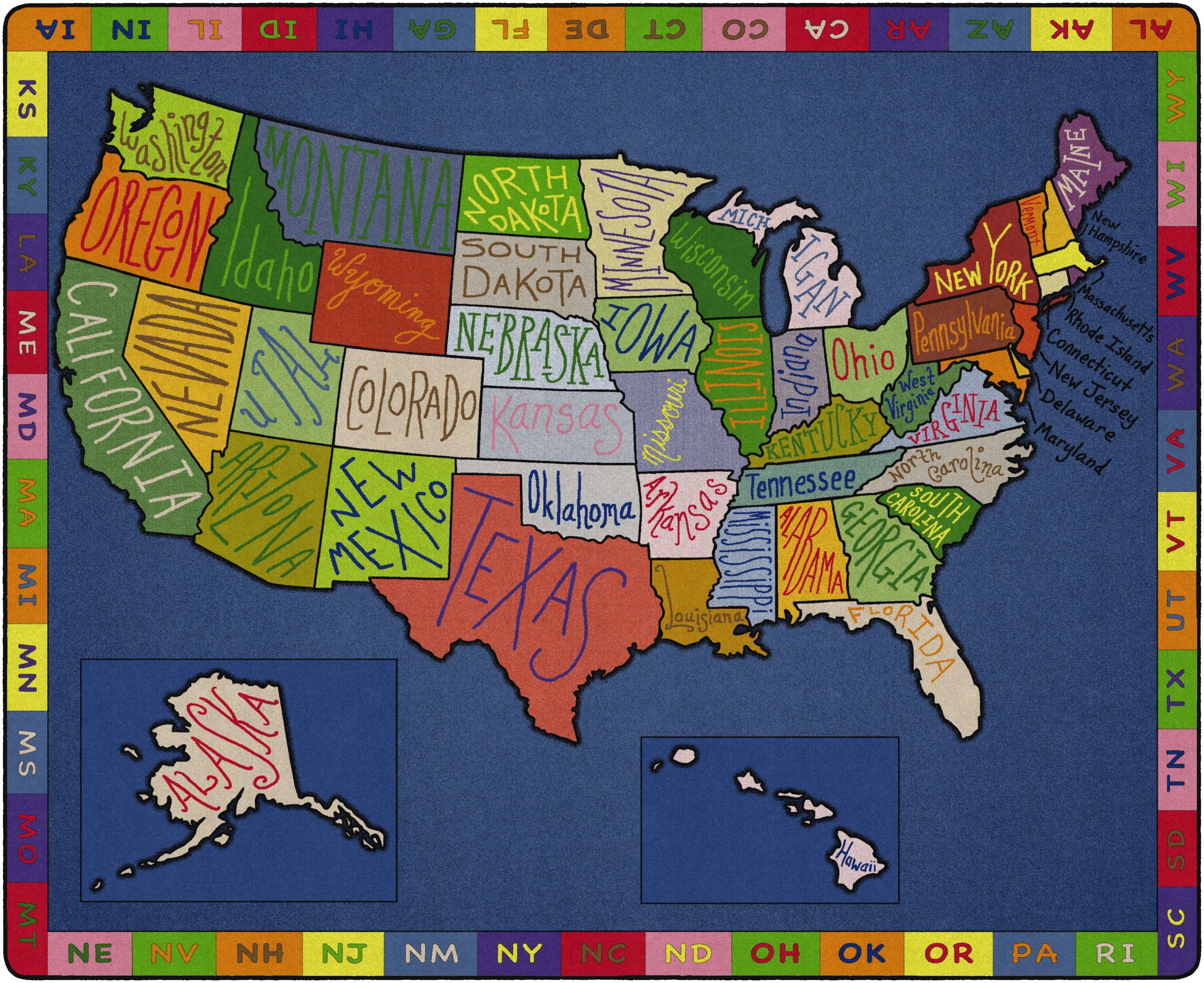 Catalog: The best way to learn the U.S. map is to doodle on a blank map. In this fun design, we have mimicked that exact concept. The border is complete with abbreviations that students can match to each state. MINE: My America Doodle Map can be a great teaching tool for identifying the names, abbreviations, shapes and locations of the states! This rug also offers the exercise of matching the abbreviations of the states to the state names!