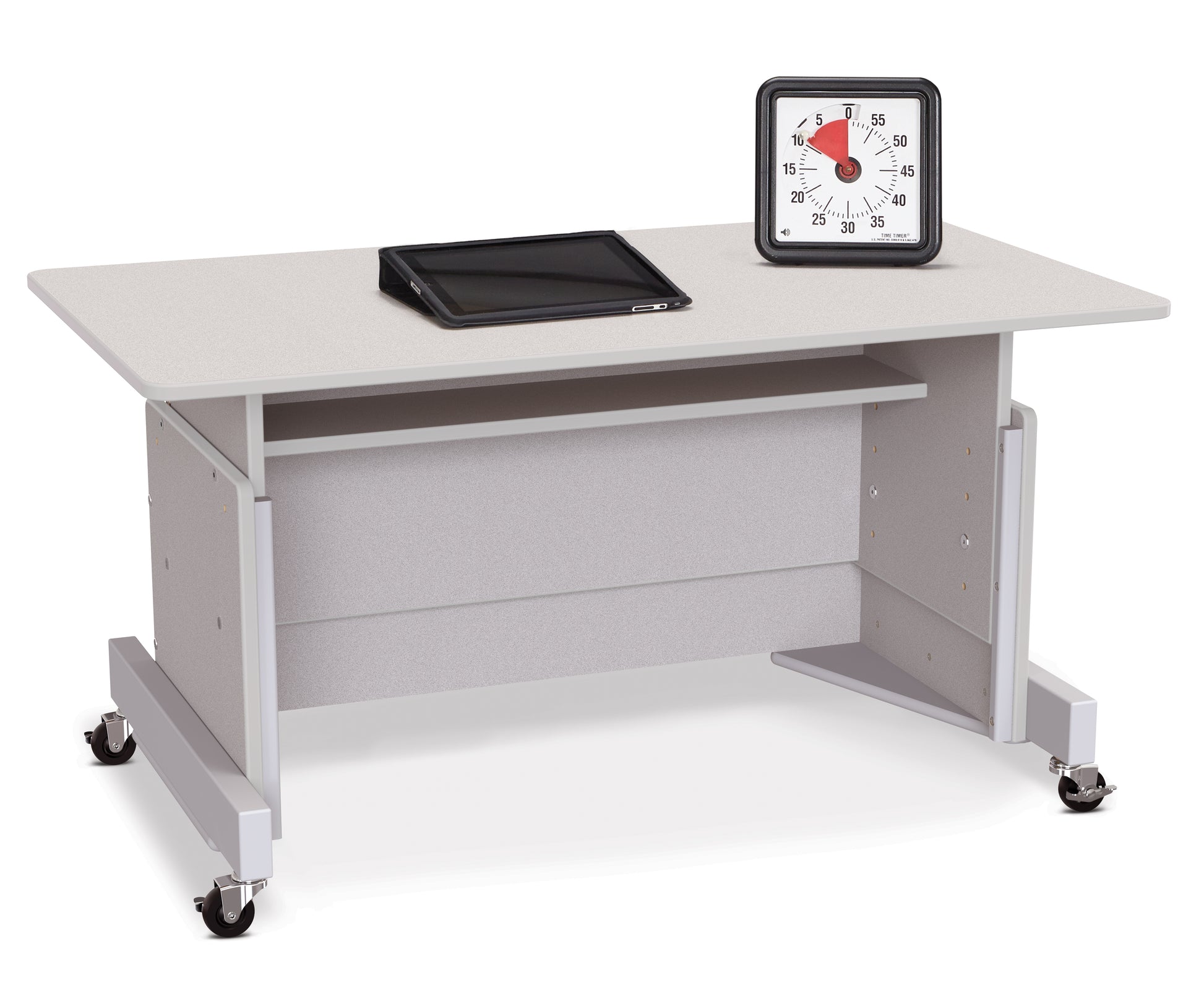 This desk can be adjusted in two-inch increments accommodating pre-school students through adults. Grommet and fully enclosed back help hide unsightly cords and wires. Storage shelf under easy to clean laminate top provides space for computer accessories. Constructed of double-sided freckled gray laminate with gray TRUEdge.