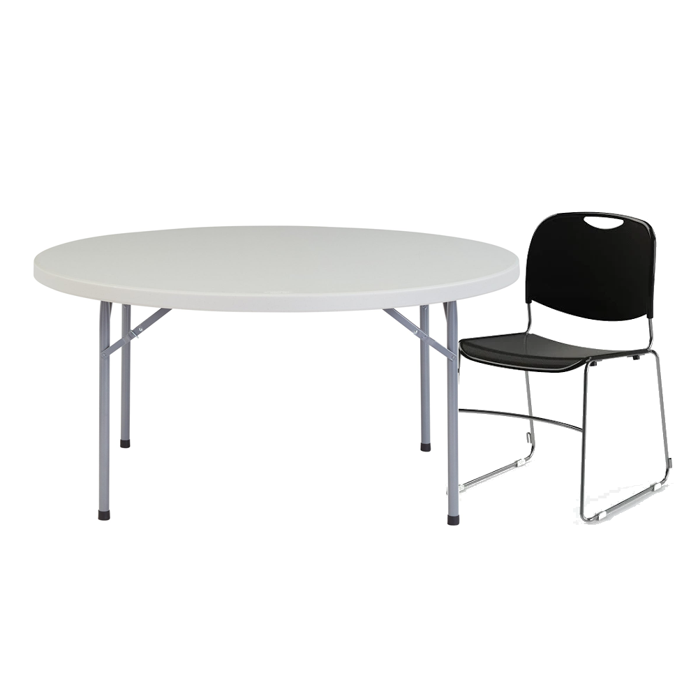 Enhance your event spaces with the 60-Inch Round Tables and House Stacker Chairs Bundle, a robust and adaptable seating solution crafted for high-traffic settings like banquet halls, fellowship areas, Sunday school rooms, and overflow seating. This comprehensive package combines durable folding tables with versatile stacking chairs, ensuring comfort, reliability, and easy setup for any occasion.