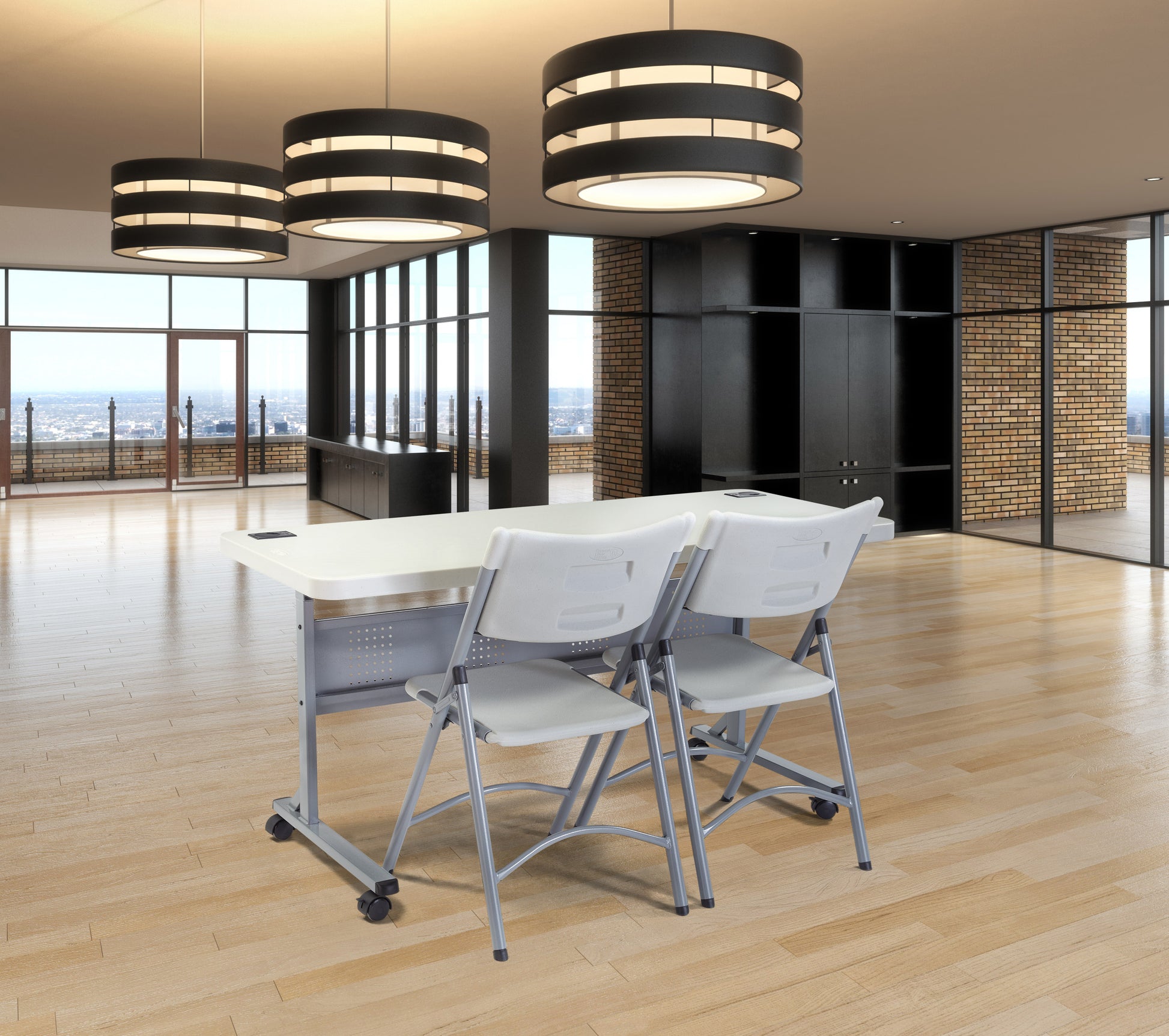 The Flip-N-Store, our Blow-molded Polyethylene Flipper Table, is a fantastic addition to any training/conference room or seminar set-up. Its smoothly textured and speckled grey high-density plastic surface flips open and closed with a dual-lever mechanism for amazingly convenient use and storage. Simple to clean and lightweight, the tables also nest together to save space and roll with ease on four 2” casters (two locking). These units feature a reversible modesty panel made of perforated steel with a built-in cable channel as well as removable dual grommet holes for wire management while keeping electronic devices connected and charged. The grey hammer-tone powder coated frame and legs are made of strong powder-coated steel and boasts a weight capacity of 700 lbs. Affordable and a cinch to assemble, you'll flip for the Flip-N-Store! The BPFT is MAS Certified Green.